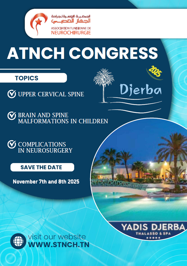 On behalf of the Tunisian Society of Neurosurgery, it is a great pleasure to welcome you to our upcoming congress, scheduled to take place on September 13th and 14th, 2024, at the Mövenpick Hotel in Sousse. This congress promises to be a pivotal event in our field, focusing on critical topics such as spheno-orbital meningiomas and orbital tumors, awake surgery/craniotomy for low-grade gliomas, and minimally invasive spine surgery.